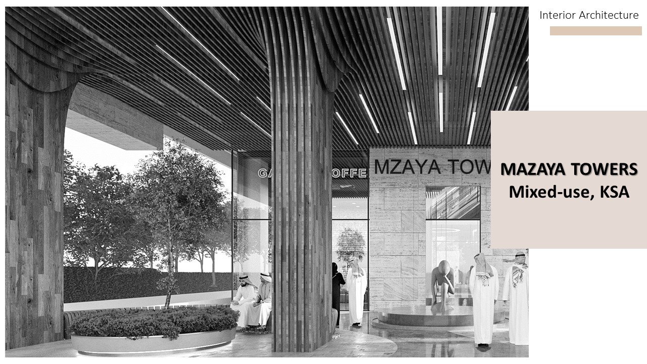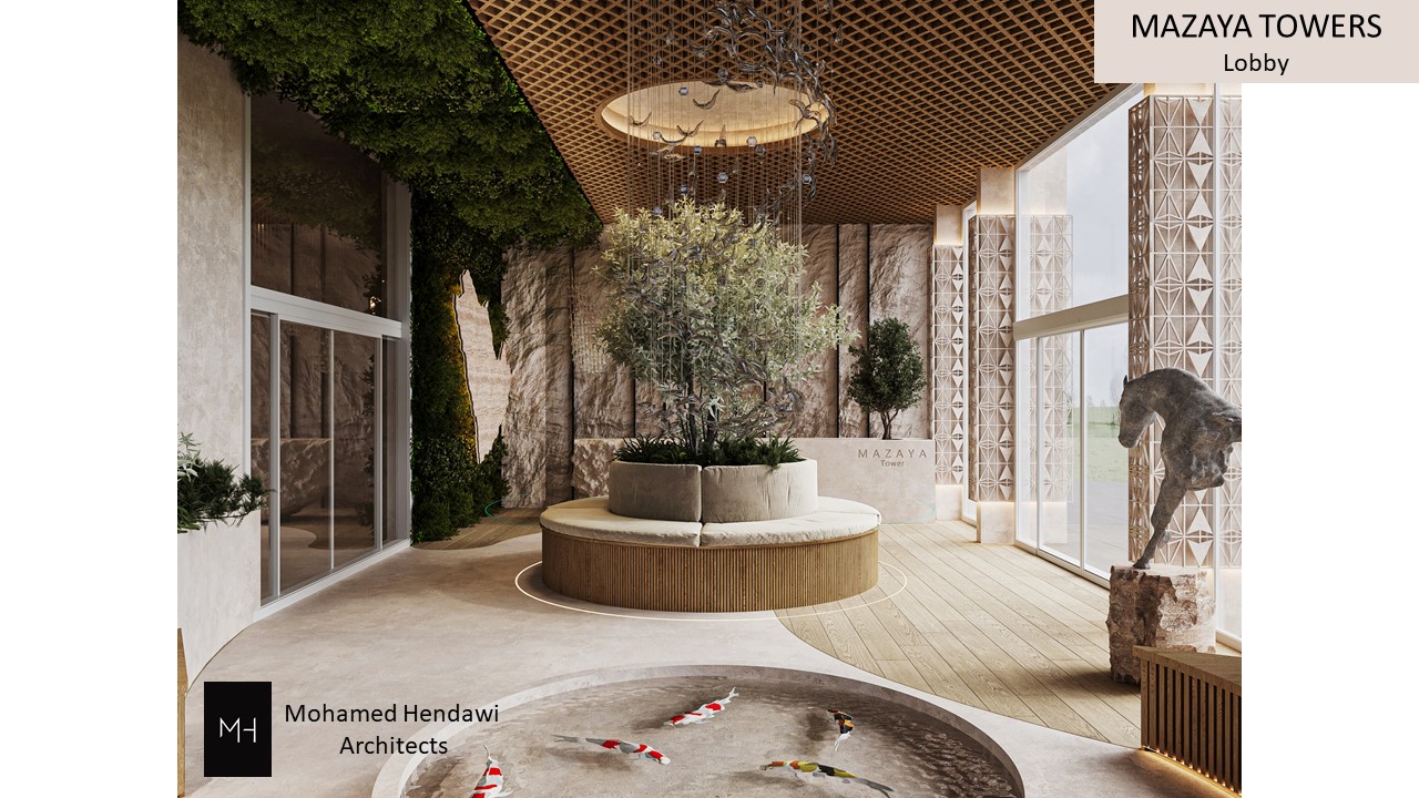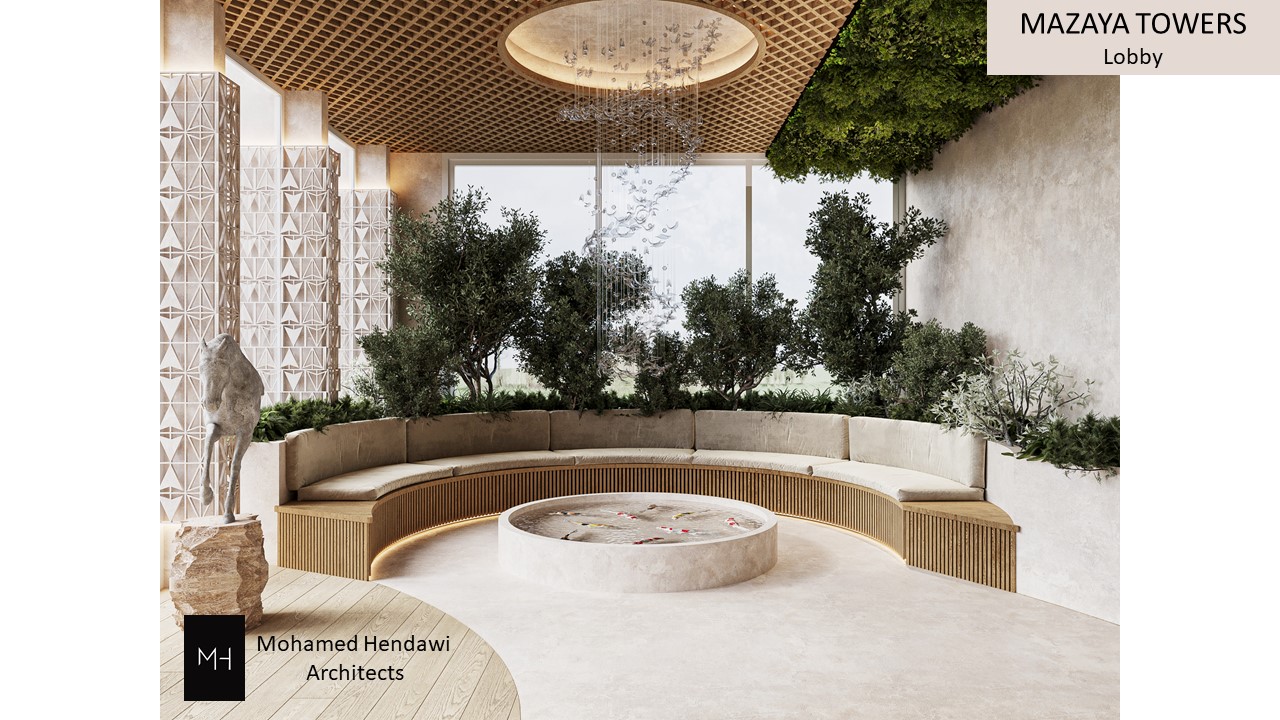 The design combines modern architectural elements with natural materials, creating a sophisticated yet welcoming entrance that reflects both elegance and functionality. The integration of outdoor space and greenery emphasizes a connection with nature, making the Mazaya Towers a visually striking and inviting destination.