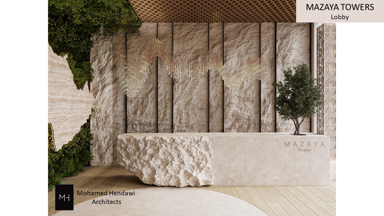 - The entrance prominently displays the name "MZAYA TOWER" in bold lettering, set against a textured stone backdrop, enhancing visual appeal.